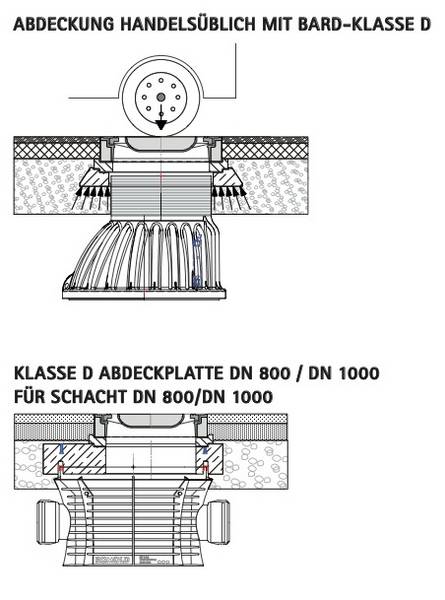 Klasse D 400: Montage erfolgt mittels ROMOLD Abdeckung mit Stützflansch auf Systemschacht DN 500, DN 625 und DN 800 bzw. bei allen Durchmessern mittels Betonauflagering (BARD) indirekt in den Straßenunterbau. Alle handelsüblichen Self-Level-Systeme sind ebenfalls mit ROMOLD Schächten kompatibel. Schäden an Abdeckungen und Rahmen sind dadurch ausgeschlossen.